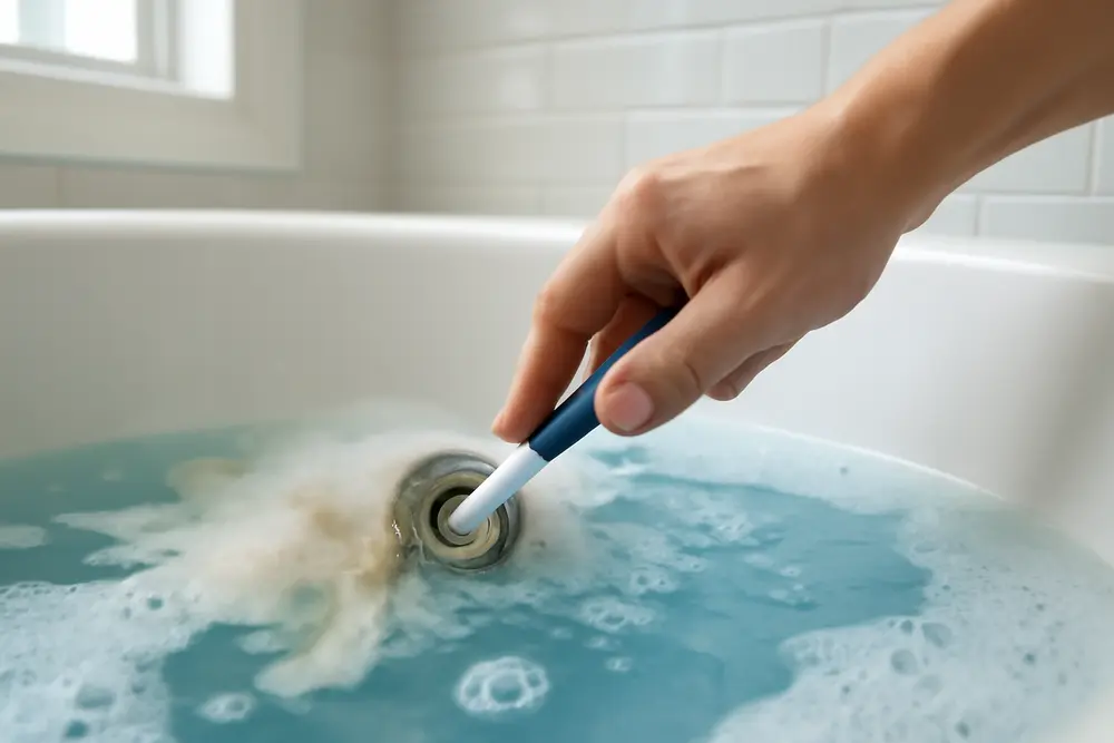 This two-phase flush is safe for most acrylic and plumbing when used as directed. Always check your tub manual first and keep the bathroom well ventilated. Do not mix cleaners, and never use bleach with acids. If the tub has not been cleaned in months, expect plenty of foam and debris in round one.